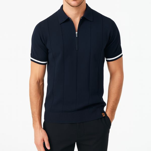 To polo wyróżnia się subtelnym, prążkowanym wzorem i wysokiej jakości materiałem, zapewniającym idealne połączenie komfortu i oddychalności. Stylowy wybór — idealny na elegancki, a zarazem swobodny look.